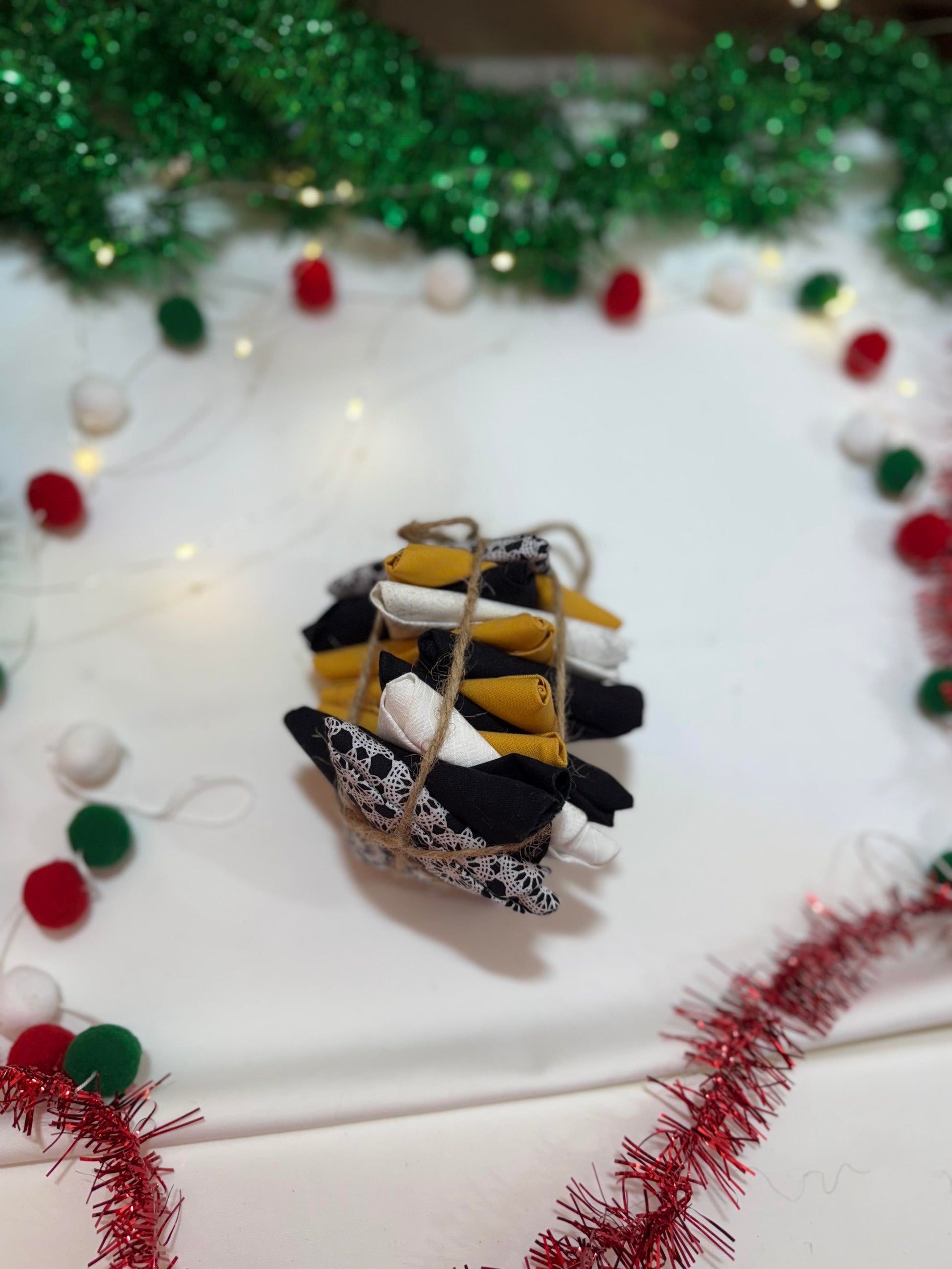 This elegant holiday bundle mixes crisp winter whites, classic black prints, and warm mustard gold accents—perfect for quilters who love a modern Christmas palette. The combination of delicate lace-style patterns with bold solids creates a striking contrast ideal for table runners, stockings, fabric ornaments, or winter-themed quilting projects.